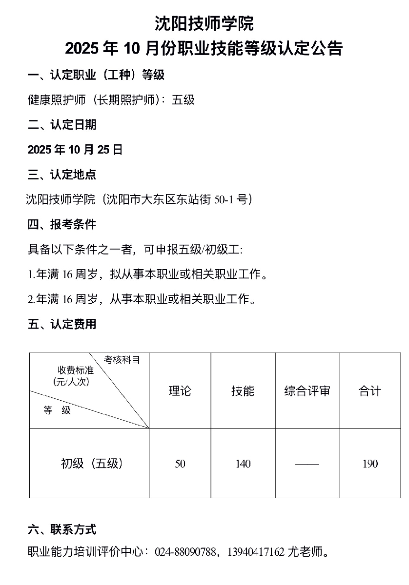 沈阳技师学院 2025年10月份职业技能等级认定公告