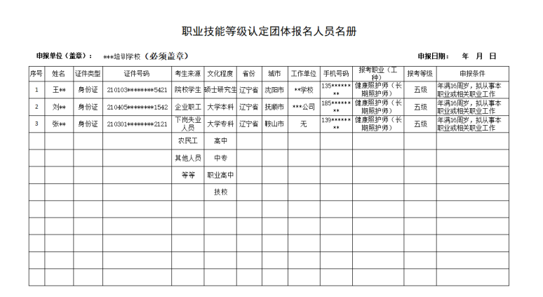 (3)职业技能等级认定团体申报表(见附件2)、职业技能等级认定团体报名人员名册(见附件3)(两个表电子版和纸版均须提交)。