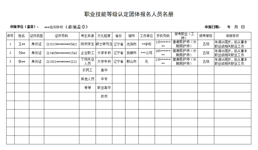 (3)职业技能等级认定团体申报表(见附件2)、职业技能等级认定团体报名人员名册(见附件3)(两个表电子版和纸版均须提交)。