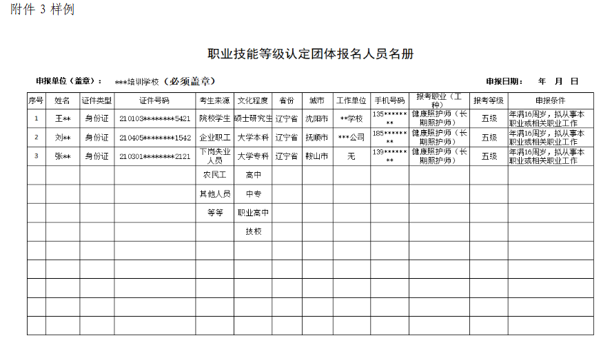 (3)职业技能等级认定团体申报表(附件2)、职业技能等级认定团体报名人员名册(附件3)(附件2、3电子版和纸版均提交)。